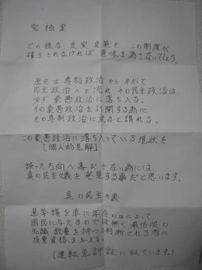 銭湯に入ってビール飲みに街まで出る。駅南の笑々で1000円飲み放題。でもこれって生ビール別途200円、生サワー別途200円で、普通に飲むと1400円。まあいいか。べろんべろんになって森下公園で遊んでいると変なおじさんがやってきた。なにやら独自の政治論を延々と語りだして面白い。かるいキ○ガイですね。わけのわからないチラシを貰う。インターネットで広めてくれといわれたので公開。