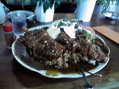 早川から竜王へ抜けてお昼ご飯にぼんち食堂。前から気になっていたここのカツカレー。オーダーして少々、やってきました。とんかつ2枚、ご飯は4合くらい?サラダとバナナも乗ってます。1000円。