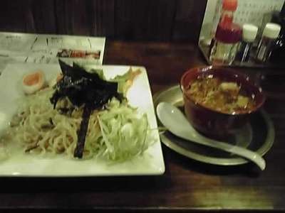 学園通りからガードくぐらず青山の交差点を左に行ってガソリンスタンド手前のラーメン屋さん。知人が頼んだのと同じつけ麺全部乗せ。おいしい。最近つけ麺がおいしくて仕方が無い。