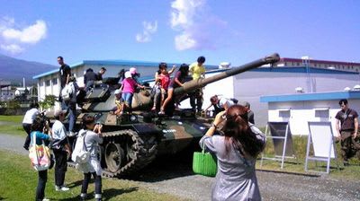 先ほどの海兵隊の展示になれた皆様、平気で74式戦車の上によじ登ってジャングルジム状態。