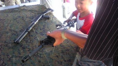 自衛隊などでは小火器を触らせてくれても、水平に構えてはいけないのですが、こちらは放任主義。マナーの問題もあるのでこれは自衛隊のほうが偉い。
