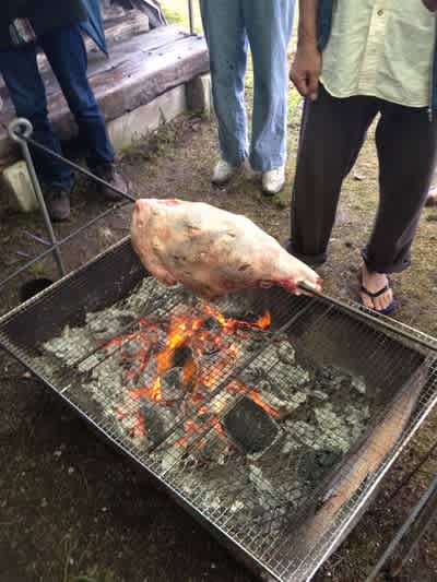 大きな羊のお肉があるので、どうせならぐるぐる回しながら焼こうということになり、15分くらいで丸焼き道具ができました。