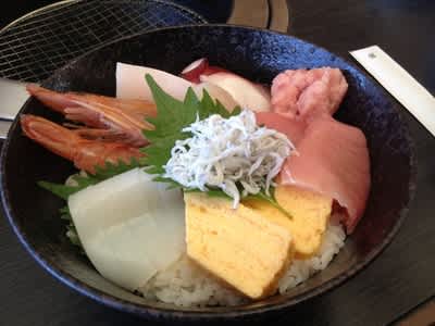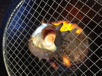 まずはお昼ご飯。カネジョウさんというお店。普段は海鮮バーベキューがメインなんだと思う。海鮮丼とサザエのつぼ焼きをもらう。
