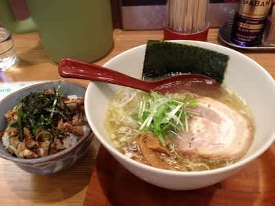 昼時なので結構混んでる。普通の塩ラーメンとランチのご飯。すっきりしておいしいと思う。