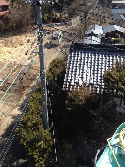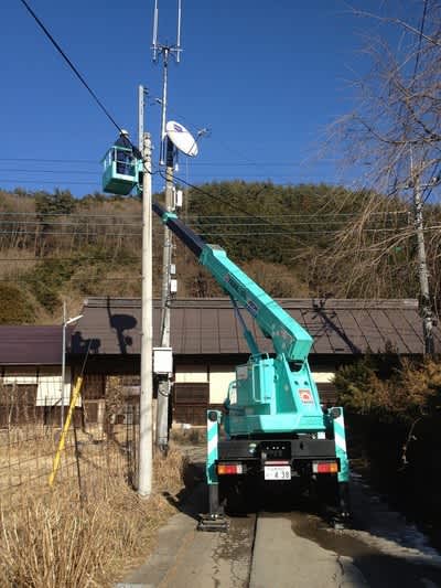 衛星インターネットですからパラボラアンテナを設置します。アンテナは高いところにつけます。なので高所作業車の上でお仕事。最初は怖かったのですがすぐになれました。