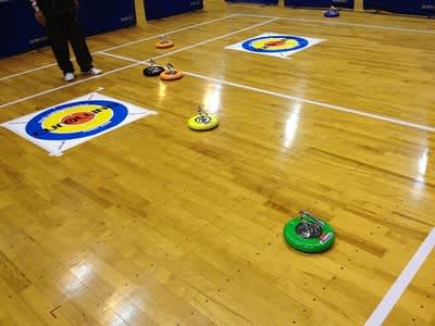 カーリング:体育館の床の上でローラーの付いたストーンを投げます、難しい。