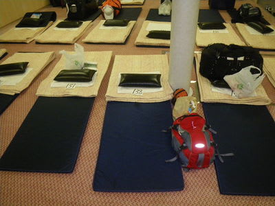 当たり前ですが二等船室です。窓が無いので照明が壁にもあり、陽が差しているみたい。そんな中で昼寝をしてたらすっかり時間間隔がおかしくなりもう20時。慌ててレストランで晩御飯カツカレー(1000円美味しくない)を食べる。