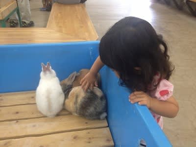 動物ふれあいコーナーでウサギを撫で回す。うちの娘さんは動物を全然怖がらないのです。そのうち犬にかまれてひどい目に合うと思います。