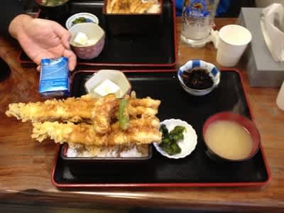 お昼ご飯はアナゴ料理で有名な「お食事処 やまよ」でアナゴ天丼1300円。おいしい。