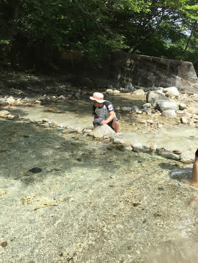 山小屋近くの川へみんなで遊びに行く。南アルプスの天然水の採取場より上流なので水はとてもきれいです。