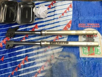バイクを浮かせてタイヤを外してフォークを抜きます。抜いたらばらしてオイルを抜いて部品待ち。