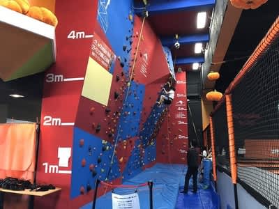 ボルダリングは7mでとても怖い。なんというのかわかりませんが落ちても安心の「自動ゆっくり落ちるロープ」を付けてくれますので怪我はしないはずです。