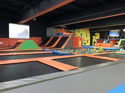 ちょっとした体育館より広い場所にトランポリンが張り巡らされている。床がすべてトランポリンだと思うとわかりやすいかも。総勢30張りくらい。いたるところで皆さん跳ねております。