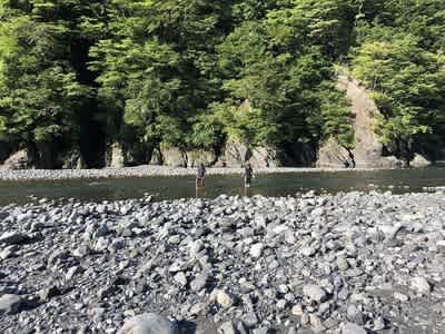 子供たちとお母さんは井川湖の渡し船に乗ります。チームお父さんは車の回送です。