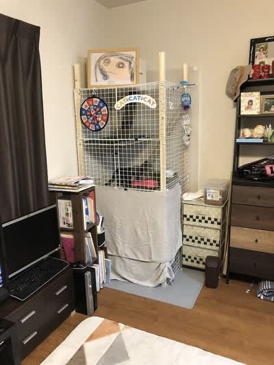 100円ショップで網を買ってきてネコ部屋を組み立て。