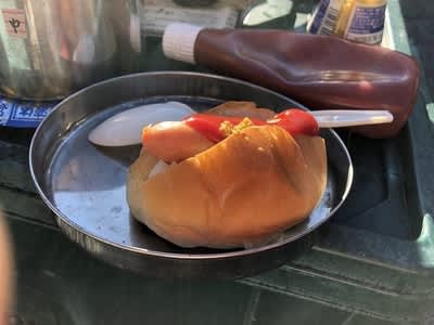 朝ご飯はダッチオーブンで温めたパンのホットドッグです。