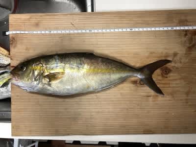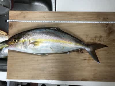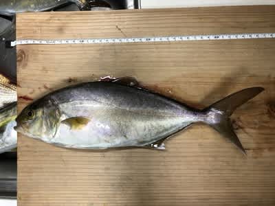 漁礁につきましてタロウさんの一投目、メタルジグにカンパチ2匹