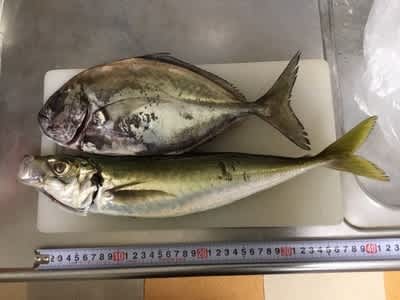 豆アジ師匠に珍しいオキアジ、DAISUKEさんに大きなウマズラが上がります。
