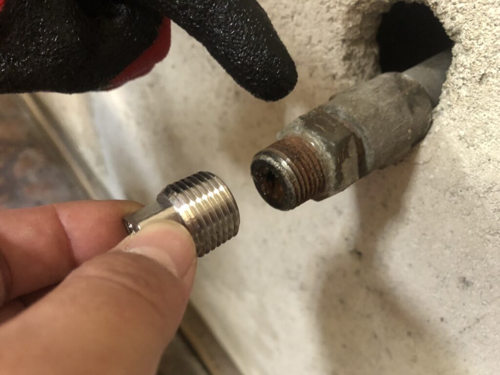 撤去しますと水道管が出てきますので、それを埋めるために昨日「呼び13(オス)」のプラグを用意しておいたのですが、水道管もオスネジ。そのためこの「平行ニップル」を外さないといけないのですが、さび付いていてどうにも回らない。平行ニップルなので逆ネジかもしれないのですが自信がない