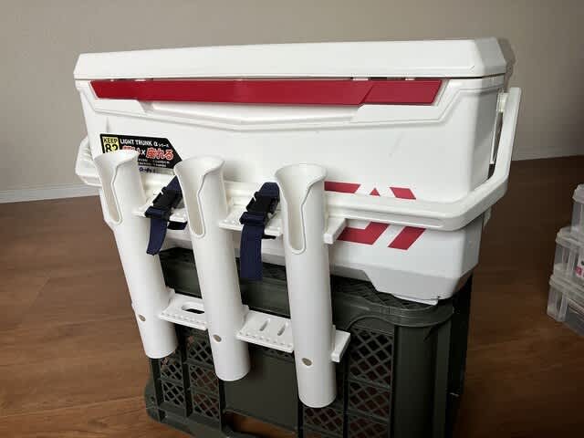 クーラーボックスをチューブ上に設置したので、それに3本竿立てを取り付けられないかいろいろ試行錯誤しまして、このようになりました。