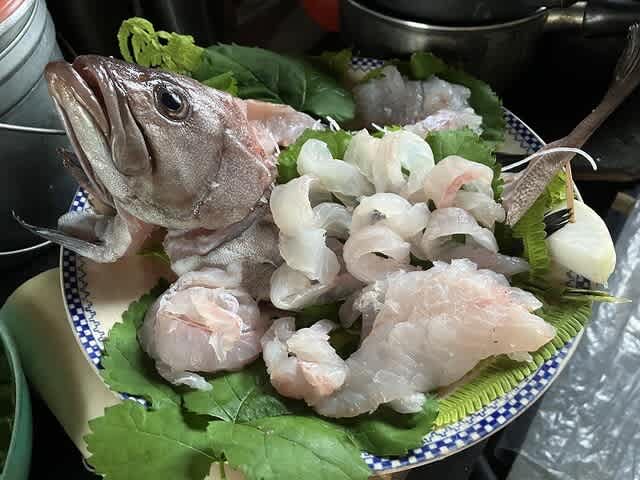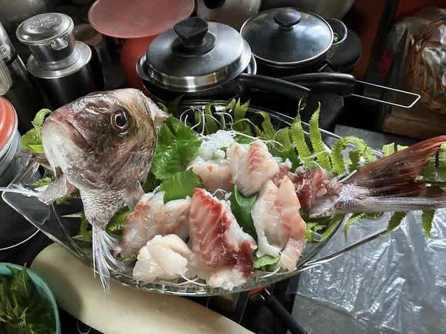 晩御飯は昨日釣ったマダイとマハタの姿造りとか、採れたて山菜てんぷらとか。