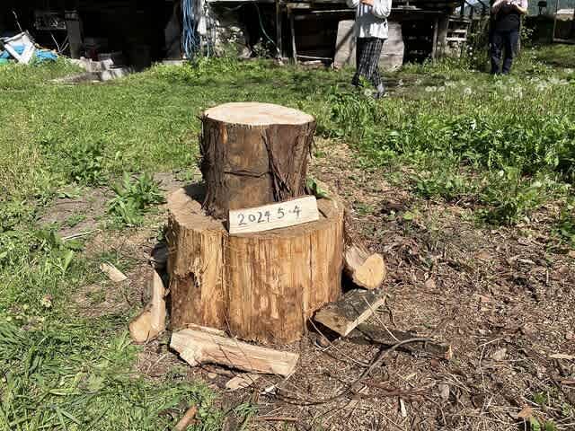 ウエディングケーキの代わりにウエディング丸太。新品の斧で入刀されます。