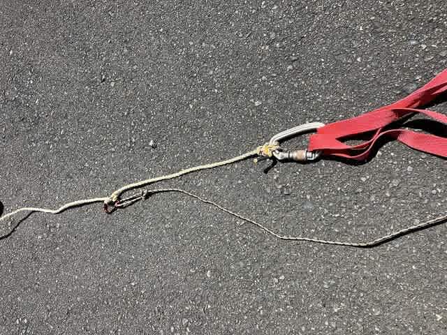 本線とパラシュートアンカーの結束部から補助ロープを出して、おしりのループを経由してフロートを接続します。。