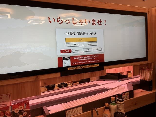 大きな液晶画面が前席についておりまして、そこに映像でお寿司が流れてる。