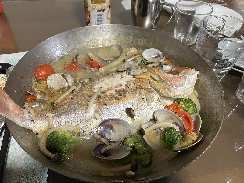 マダイオーブン焼き、アクアパッツァ、お刺身、フライ