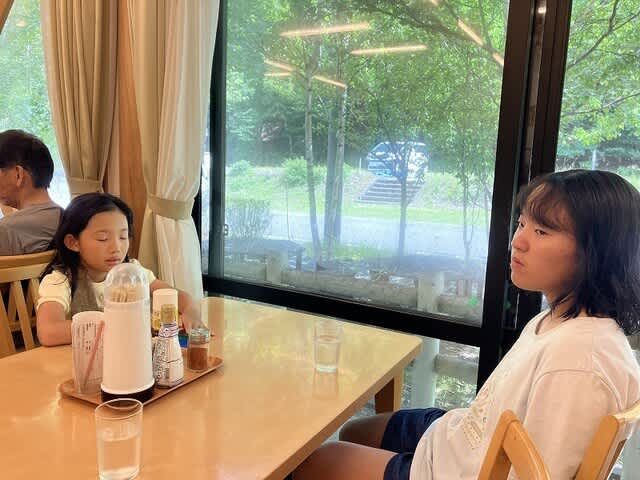 温泉に入ってお昼ご飯時には娘様たちはクタクタ。帰りは爆睡です。