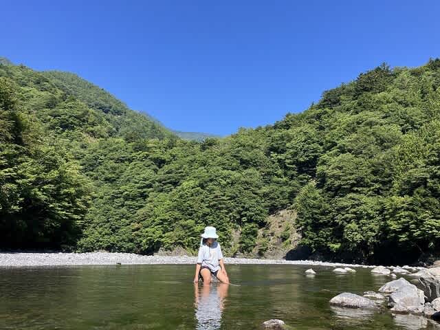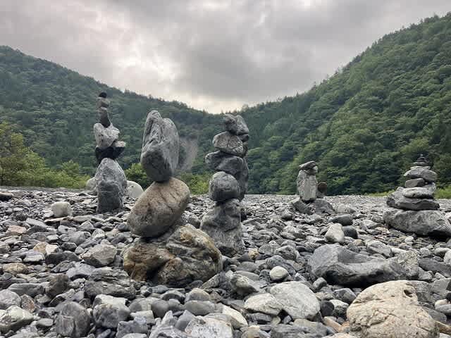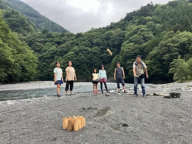 泳いだりモルックをしたり石を積んだりして遊びます。