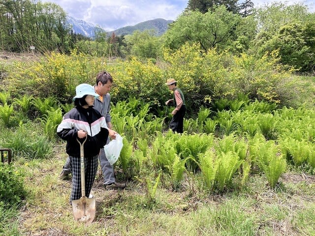 お昼ご飯用の山菜を集めに行きます。