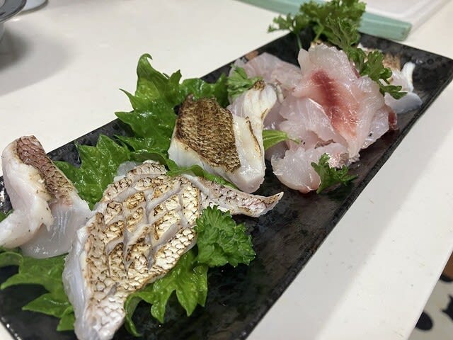 晩御飯は娘と二人で豪華なお刺身とタチウオの塩焼き、タイのアラのお味噌汁。