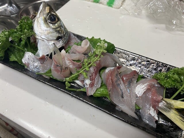 昼過ぎに豆アジ氏が魚を取りきてくれたので太郎さんの釣った魚を渡す。