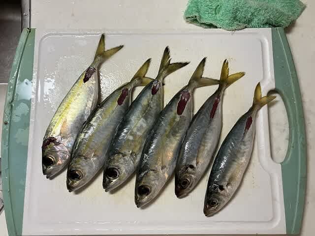 しかし昨日より明らかに大きなアジばかりで、餌に向かないし食べたいしで、またお持ち帰りのアジが増える。